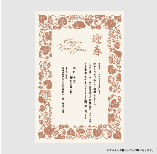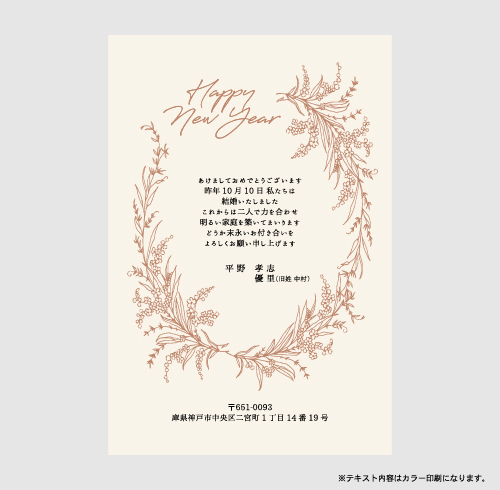 風味のあるアイボリーの紙にぎゅっと草冠のフレームを活版で押したお洒落な結婚報告年賀状です。