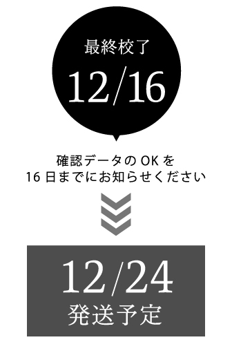 - 入力データをいただいたのち、確認用の原稿をメールにてお送りしますので、折返しOKのメールをお返しくださったタイミングが校了となります。(OKメールが無い場合は責了となる場合がございます。ご了承ください)