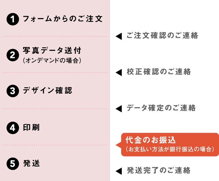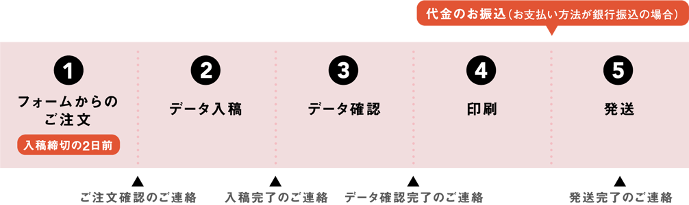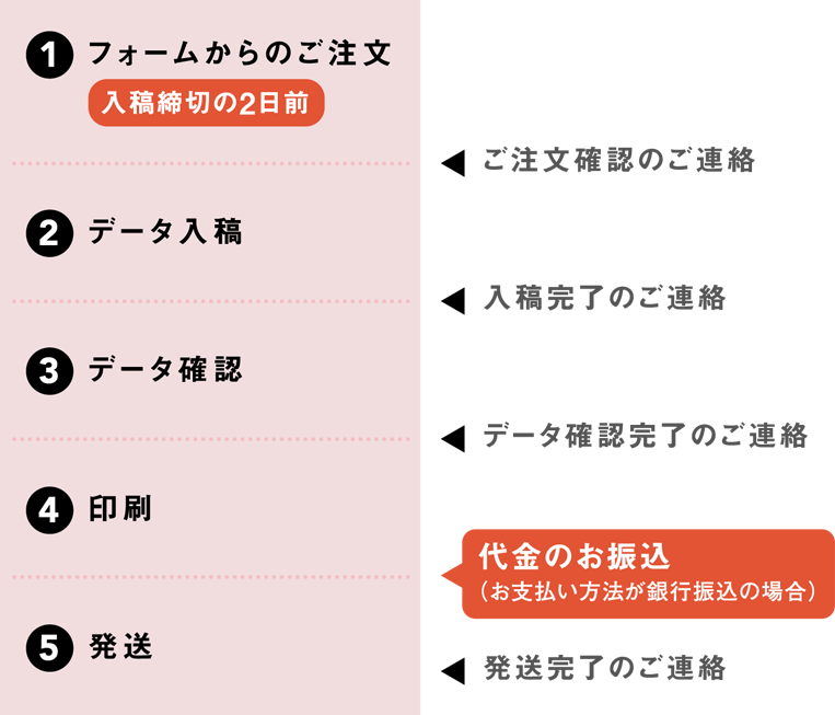キャンセルについては、データ入稿のお客様は入稿前に、デザイン年賀状は校正確認のご連絡前までに、キャンセルの旨をご連絡ください。