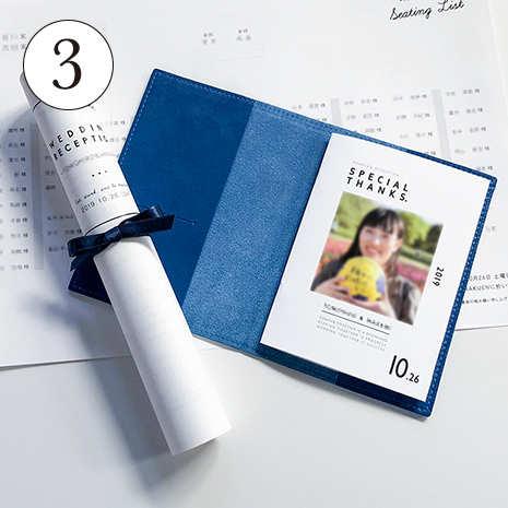 プロフィールブックに[オリジナルブックカバー(牛革)]を合わせた楽しい席次表セットです。プロフィールブックのカバーとして使ったあとは文庫カバーとしてご使用いただける2WAY仕様!!裏面には空押しで素敵な文字が活版印刷されています。