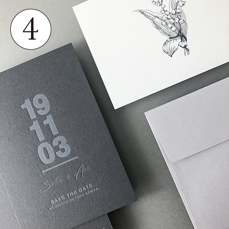 シンプルだけど単調にならない紙使いのテクニックと、結婚式らしい品格があるグレーの紙が素敵なカード型招待状です。ゲストカードのスズランの活版印刷がおしゃれ!余白感のあるデザインに活版印刷が映えます。