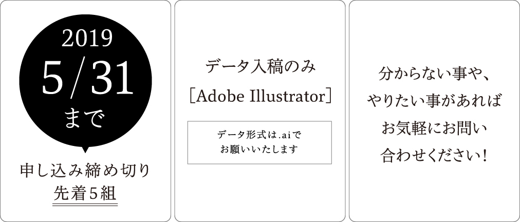 - お客様が作成されたデータを入稿して頂く[データ入稿のみ]の受付とさせて頂きます。またデザインの内容によって印刷が困難な場合は、データ変更or修正して頂く場合がございますので、ご了承ください。