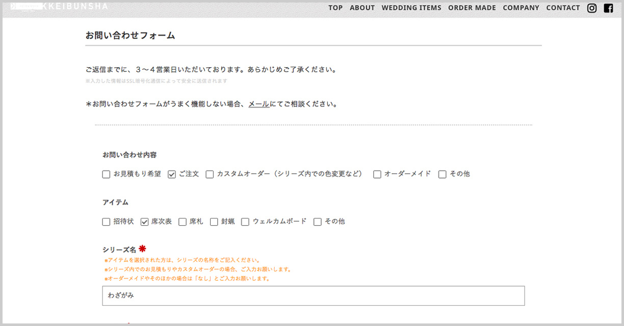 お問い合わせフォームにてお問い合わせ内容のご注文をチェック。