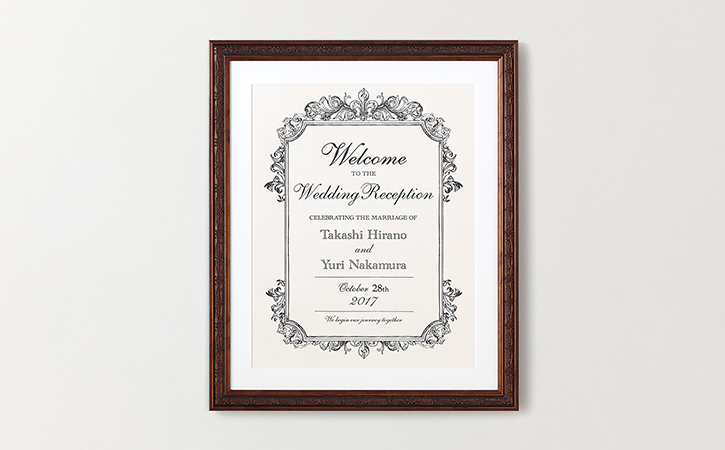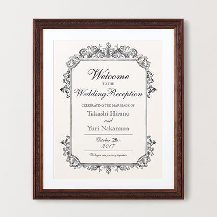 格式と高級感のあるフレームがまるで海外の結婚式のような印象のウェルカムボードです。チャペルやホテルでの挙式にも合わせやすくてオススメです。