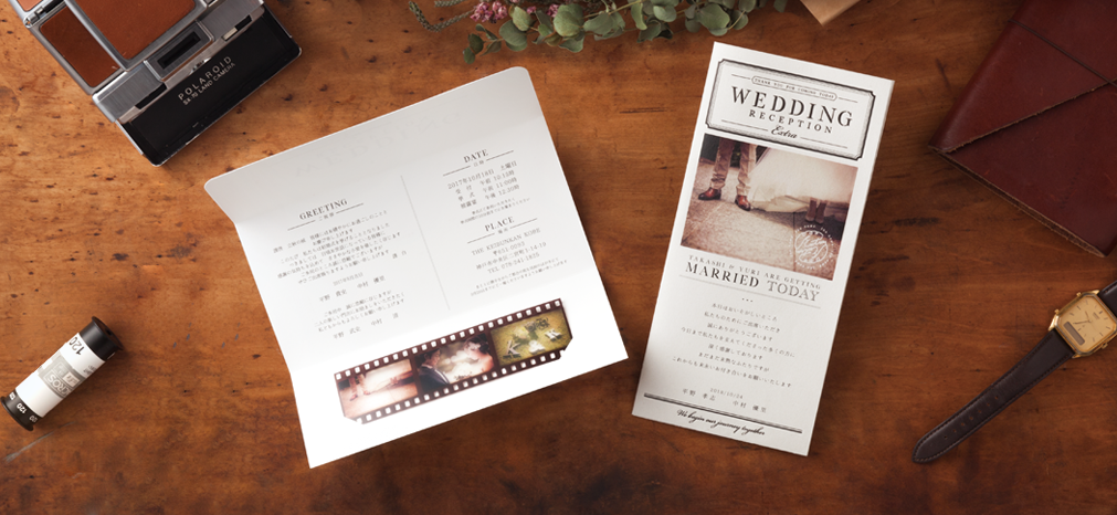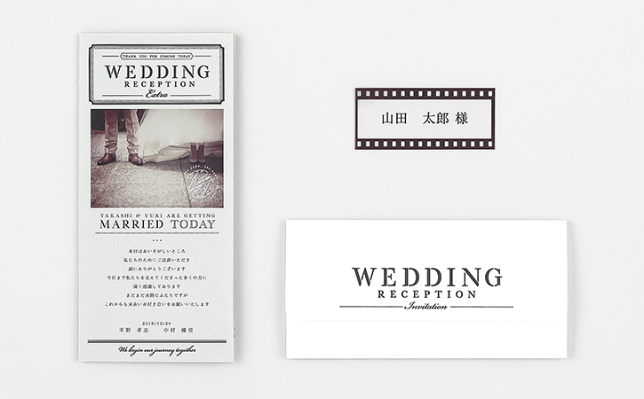 席札とチケットはまるで本物のカメラフィルムのよう。カメラや映画などのコンセプトウェディングはもちろん、写真を使って大切な人に感謝を伝えながら一緒に楽しんでもらえる素敵な結婚式を演出できます。