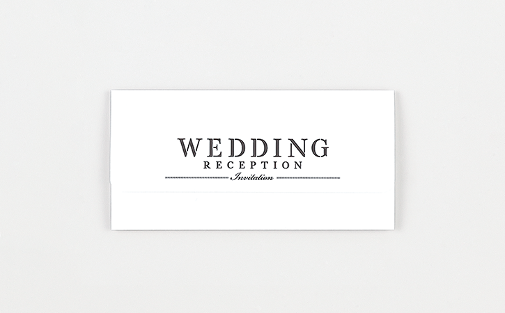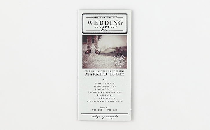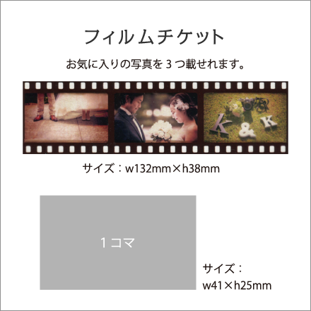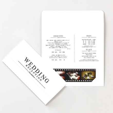 高級感のある活版印刷がギュっと入った封筒風の表紙を開くと中面が招待状に。フィルム型チケットにはお好きな3種類の写真を載せれます。会場の写真を入れて雰囲気を伝えたり、ドレスコードやコンセプト等をさらりと知らせる手段として使うのもお洒落!