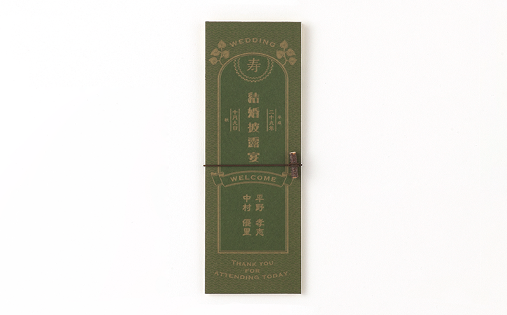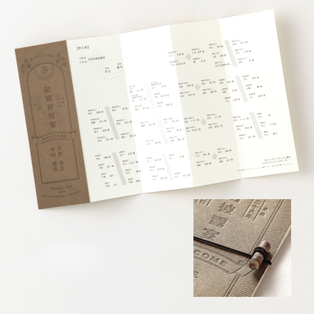 折りたたみ式の席次表に小枝を付けた紐がポイント