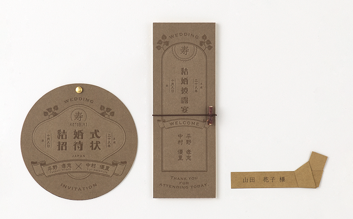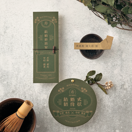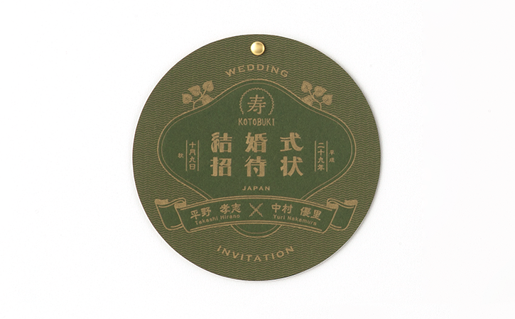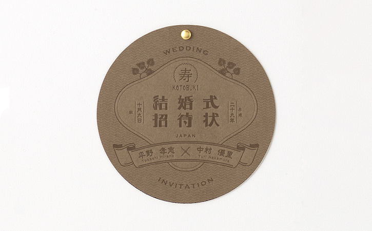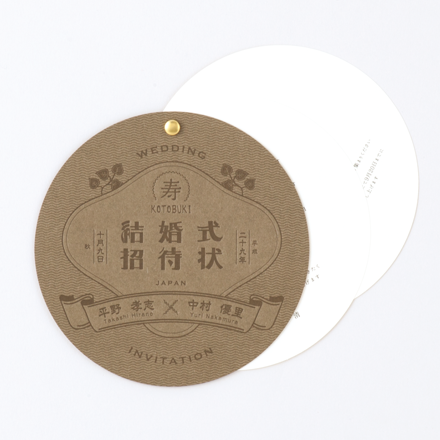 レトロな雰囲気の招待状は、丸型に抜いた表紙が粋なモダンさを演出。鋲綴じスライド式で見やすく、活版印刷の自然な手触りが素朴な和の要素をプラスしてくれます。