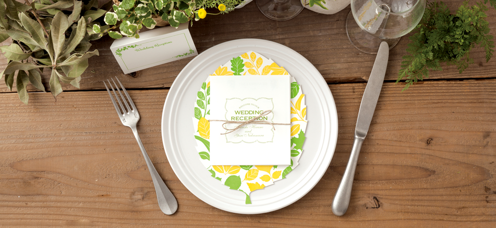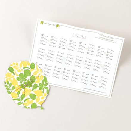葉っぱ型のカードにセットされた席次表は、折りたたみタイプ。メニューやプロフィールはもちろん配席表もたっぷり入ります。
