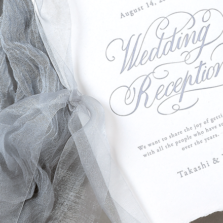 ふわふわのオーガンジーのリボン、特注のミミ付きのハンドメイドペーパーと封筒、活版で入ったイニシャルモチーフ。