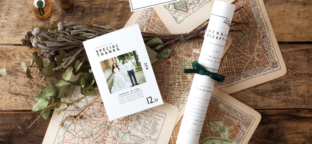 シンプルな活版の招待状と流行の巻き型席次表にプラスしてゲストに向けたメッセージを1冊の本に。