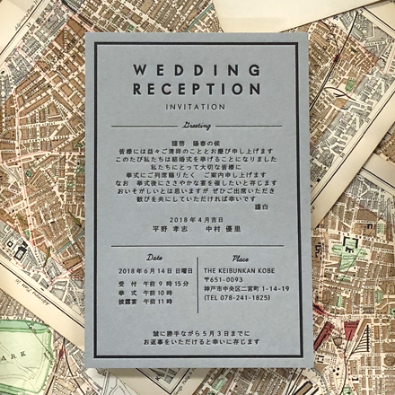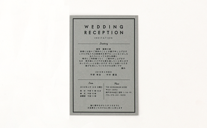 グレーの厚紙にボコっとした活版印刷が映えるカード型の招待状です。扱いやすいサイズとシンプルなデザインが人気のポイントです。