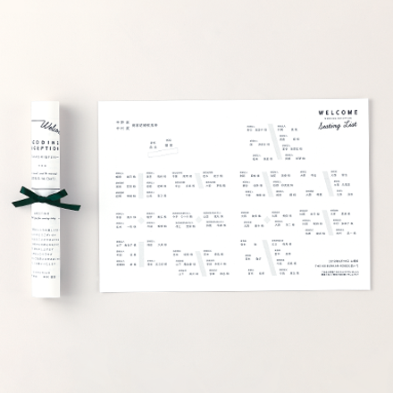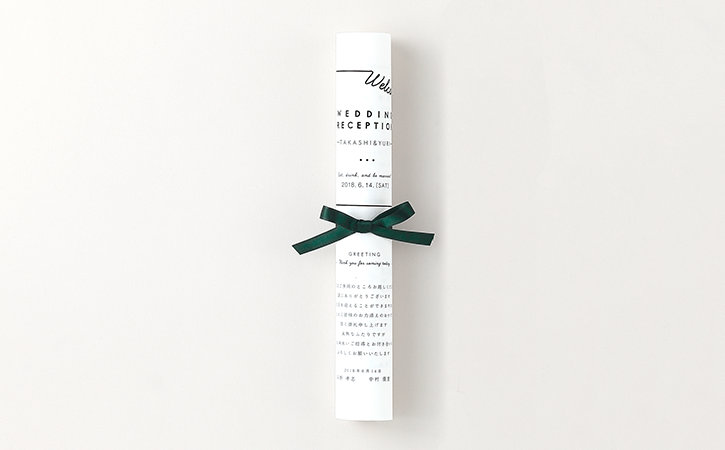 折り目がつかないのが嬉しい巻物風の席次表には、グリーンのリボンをアクセントに。シンプルなデザインでシチュエーションにとらわれず様々な会場で使えます。