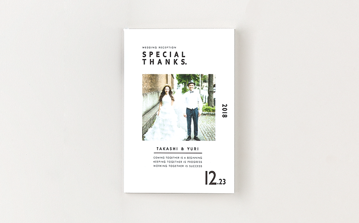 感謝の気持ちをカタチに出来るミニブックです。一人一人に向けた感謝のメッセージをしっかり製本して各テーブルへ。ゲストとの絆を深められる素敵なペーパーアイテムです。
